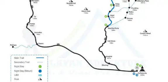 - Navigation and Orientation: The Manaslu Circuit Trek map provides detailed topographical information, ensuring trekkers stay on course, especially in remote areas with fewer signposts.
