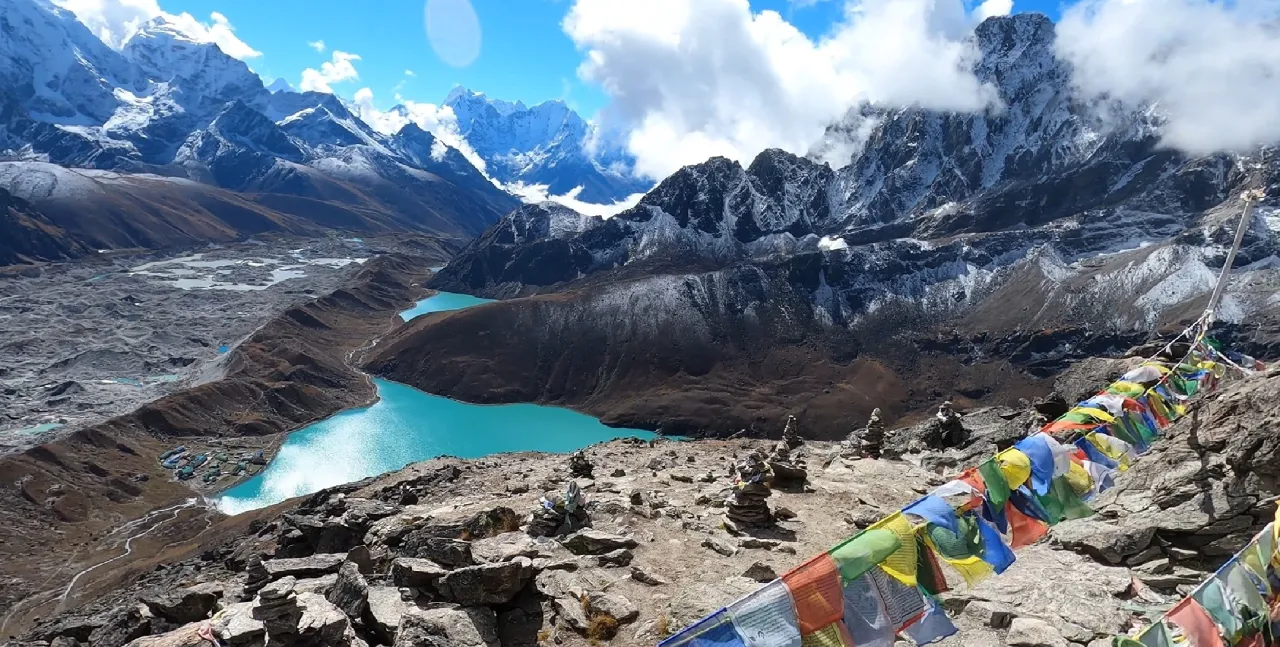 Complementing the sight is the presence of the Ngozumpa Glacier, the longest icy glacier in Nepal, the Renjo La and Cho La Passes.