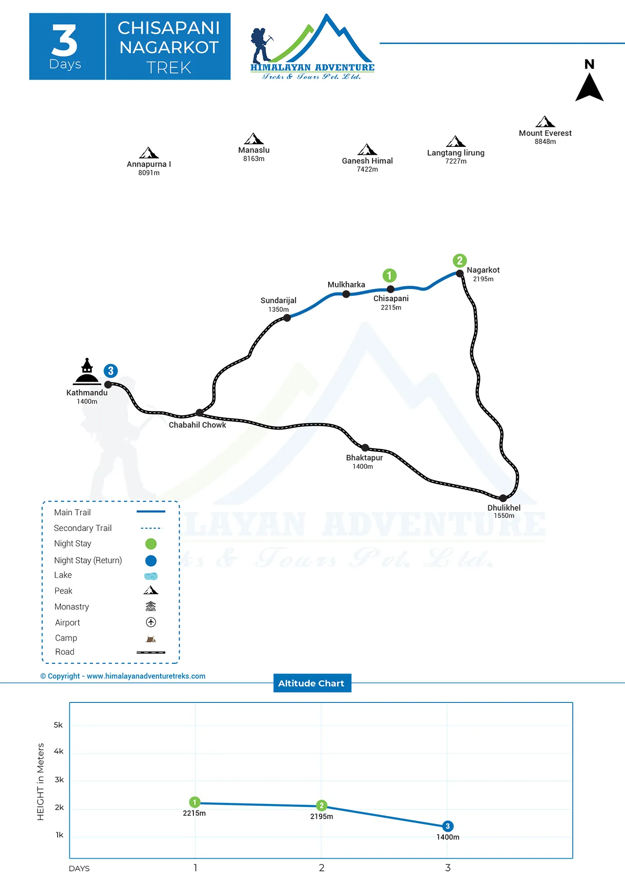 The trek typically lasts 3 days and 2 nights, starting from Sundarijal, passing through Chisapani, and ending at Nagarkot. The total trekking distance is approximately 35 km (22 miles).