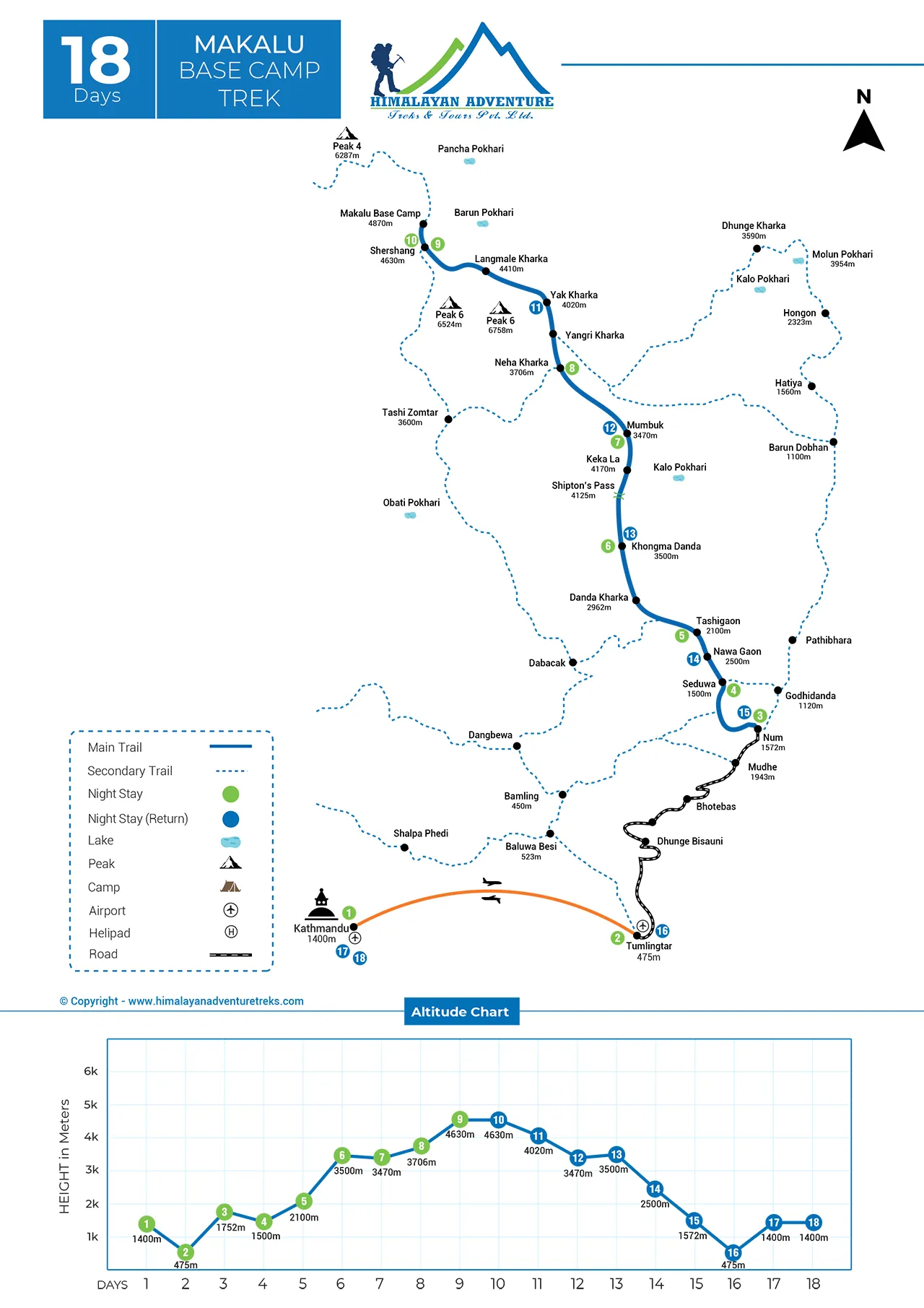 The trek typically takes 18 to 22 days, depending on the route and acclimatization schedule. It includes travel to and from Tumlingtar, several days of trekking through villages, forests, and glaciers, and time spent at Makalu Base Camp (4,870m).