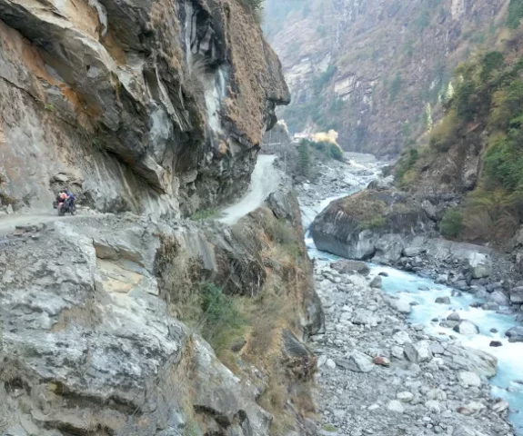 After a smooth 80 km ride, the trail will be rocky, which will elevate above the Kali Gandaki River. It will start to tighten till we are at the hot spring village of Tatopani (1200 m).