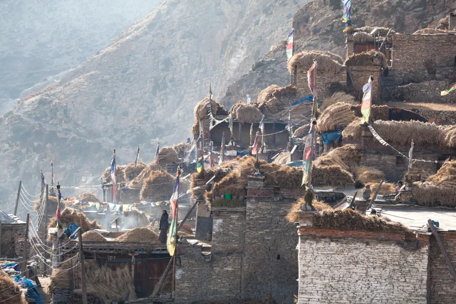Towards the end of the afternoon, we arrive at Namrung (2,900 m), a stone-enclosed checkpoint village where there are several lodges. In case of clear weather, one can see Ganesh Himal and Shringi Himal. We get ourselves into a teahouse and rest most delightfully.