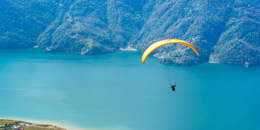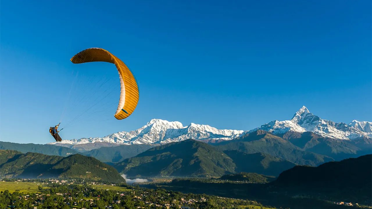 Paragliding starts from Sarangkot, a hilltop at an altitude of 1,592 meters above sea level, and ends by landing near the shore of Phewa Lake in Pokhara. The entire flight offers spectacular views of the Annapurna mountain range, Pokhara Valley, and Phewa Lake.
