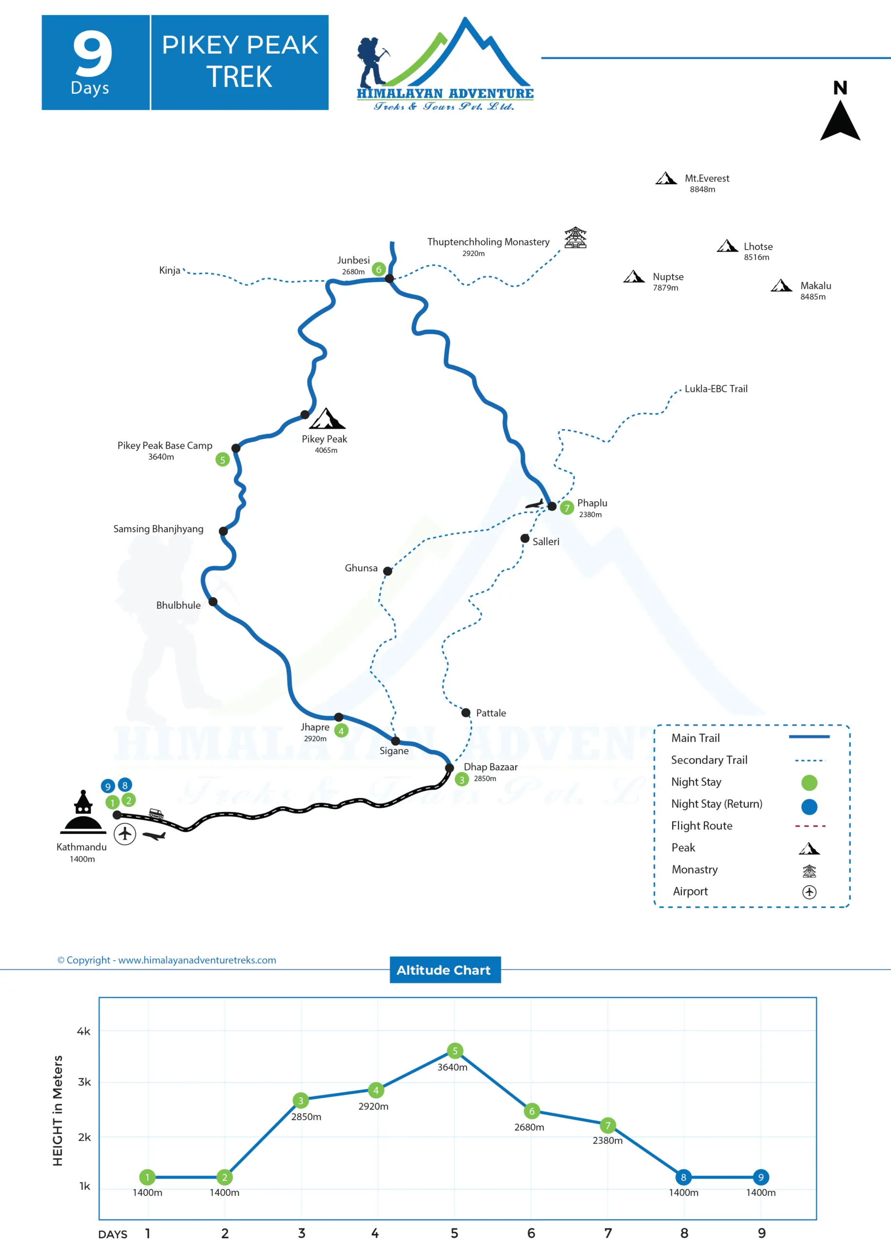 On the following day of your 9-day Pikey Peak Trek, the journey continues with a seven- to eight-hour drive to a Dhap Bazaar, where your trekking will begin via Sigane towards Jhapre village, lying at a height of 2920 meters. From there, you will trek to different destinations like Pikey Peak Base Camp, Junbesi, and Phaplu, with an unforgettable overnight stay in each destination.