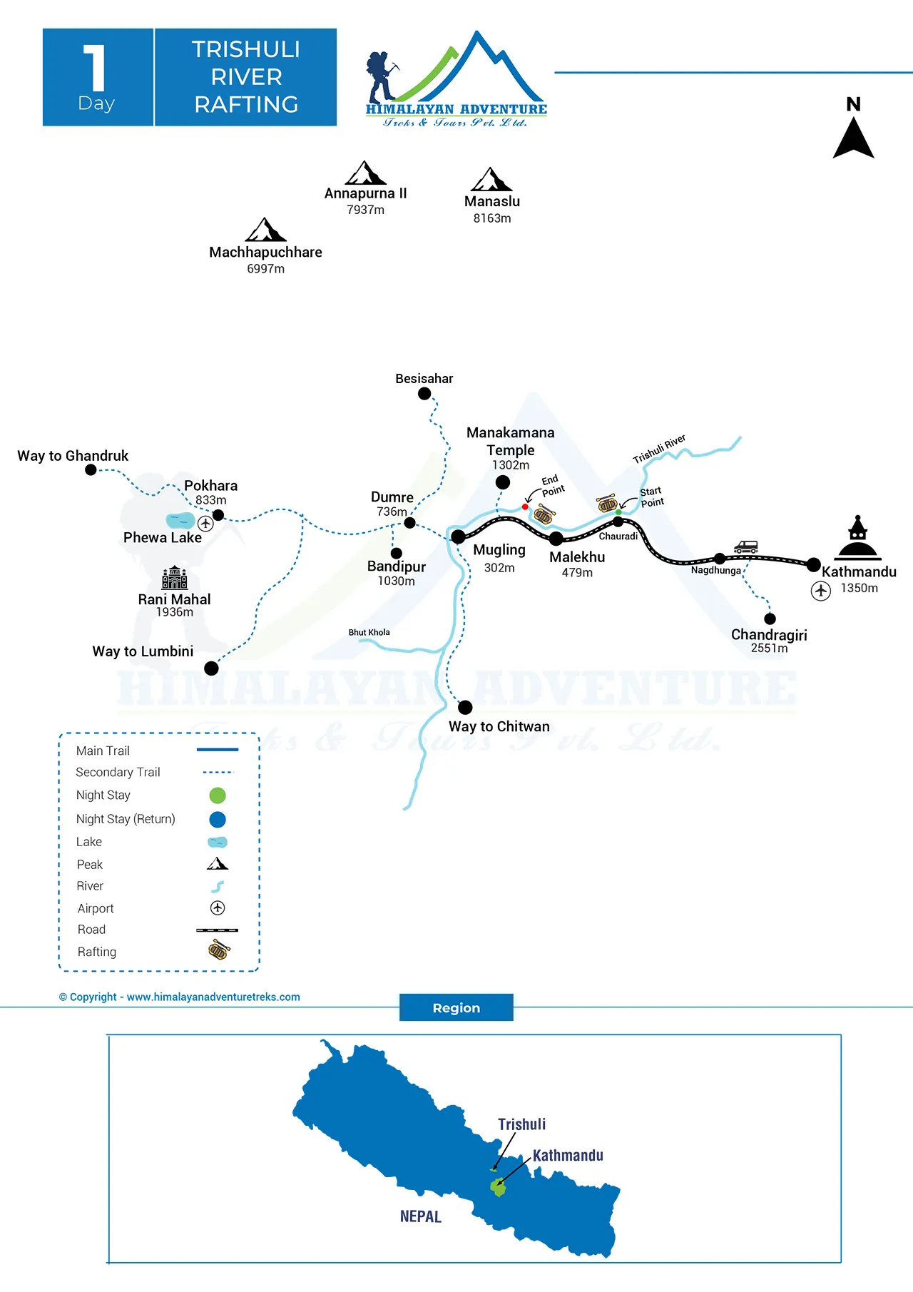 The rafting trip begins at Charaudi and ends at Mugling, both located along the Prithvi Highway. Charaudi is about a 3-hour drive from Kathmandu, making it an accessible and popular rafting spot.