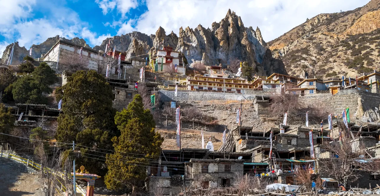 After we sharply drive down the pass, we will come across the peaceful white figure of the White Palace and then Ghar Gompa. However, the Bhrikuti, Annapurna, Tilicho, and Nilgiri will steal the show.