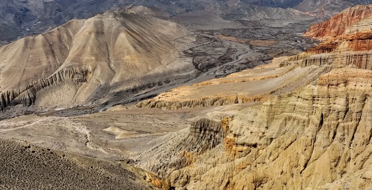 Leaving Chhuksang, the trail crosses the Kali Gandaki River over a bridge and enters a fascinating landscape of red cliffs and eroded rock formations. Along the riverbed, you might come across pieces of turquoise-colored stones, a rare and beautiful mineral that adds to the mystique of the Mustang region.